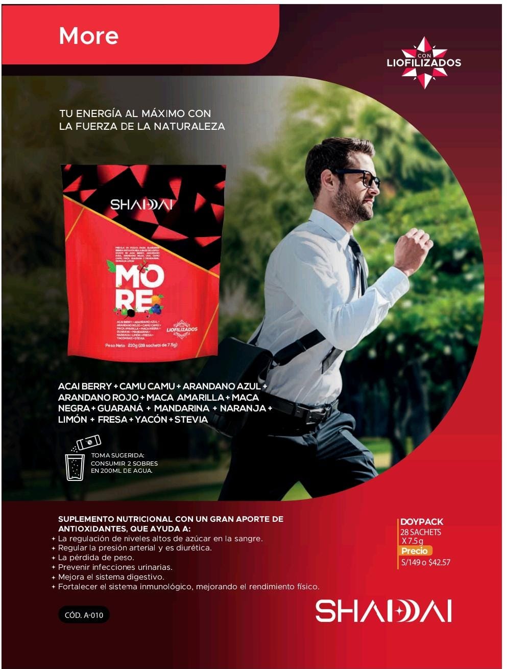 Su exclusiva mezcla de açaí, maca, guaraná y frutas antioxidantes te impulsa cada día.